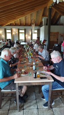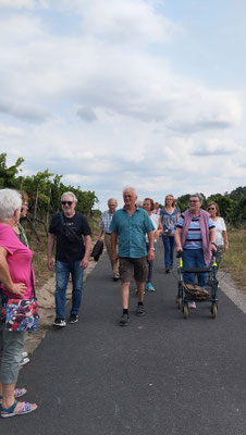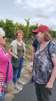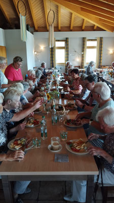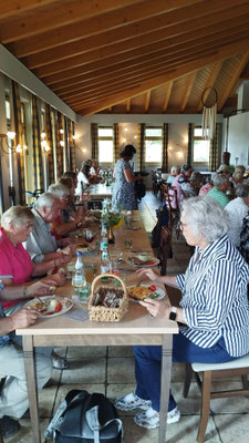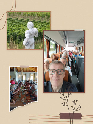 Nach kurzer Fahrt erreichten wir das Weingut Steinmanns Töchter, wo uns Alex Steinmann, die Tochter des früheren Bürgermeisters Hans Herrmann, bereits am Bus herzlich empfing. Wer gut zu Fuß war, machte mit Alex’ Mann Stefan einen Abstecher zum Aussichtspunkt. Der Blick über die Weinberge war einfach traumhaft! Die anderen ließen es sich in der Zwischenzeit schon mit einem Getränk gutgehen. Wieder vereint, nahmen wir alle Platz und kamen schnell ins Plaudern. Zum Essen gab es das vorbestellte Vesper oder Kaffee und Kuchen – alles war sehr lecker und alle waren rundum zufrieden. Die Stimmung war fröhlich, die Gespräche lebhaft, und die Zeit verflog nur so. Bei Wein, Getränken und Geselligkeit fühlten wir uns alle pudelwohl.